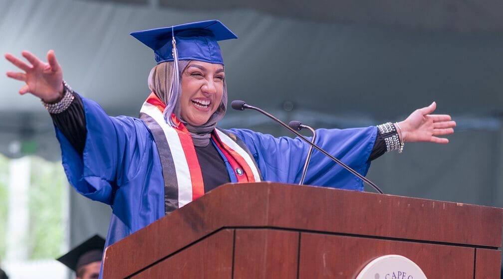 Student speaker, Zainab Abd Alkaby, a graduate from the College’s Dental Hygiene program and a Sergeant in the Massachusetts Army Reserve, echoed that message, reminding her peers that they were not just stepping into new careers post-graduation, but “stepping into the world with the power to share smiles, build bridges, and bring light into people’s lives.” Alkaby also made special note of the role civic learning and engagement plays in laying an academic foundation, citing her own experiences advocating for 4Cs and other community colleges at the National Legislative Summit in Washington D.C. earlier this year.